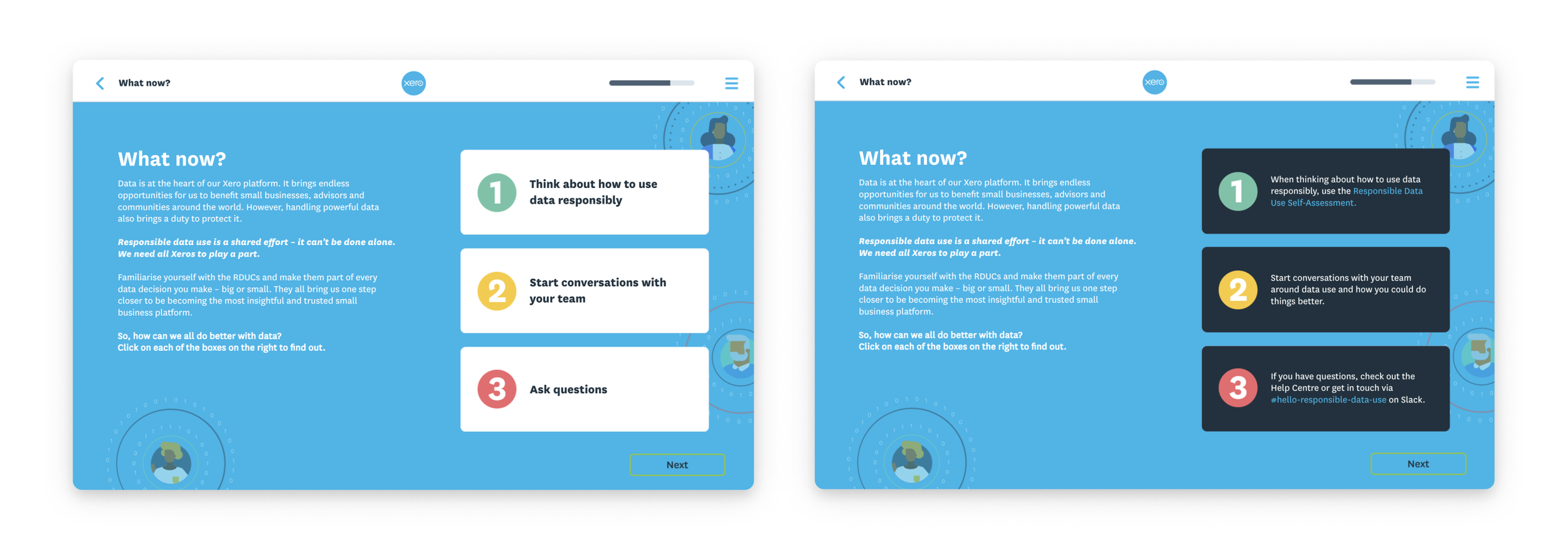 Xero needed to develop a learning module to educate internal staff about ‘Responsible Data Usage‘. Working with Inspire Group, I designed a user interface which considers the Xero brand guidelines and incorporates illustrated characters to help users navigate the topic.